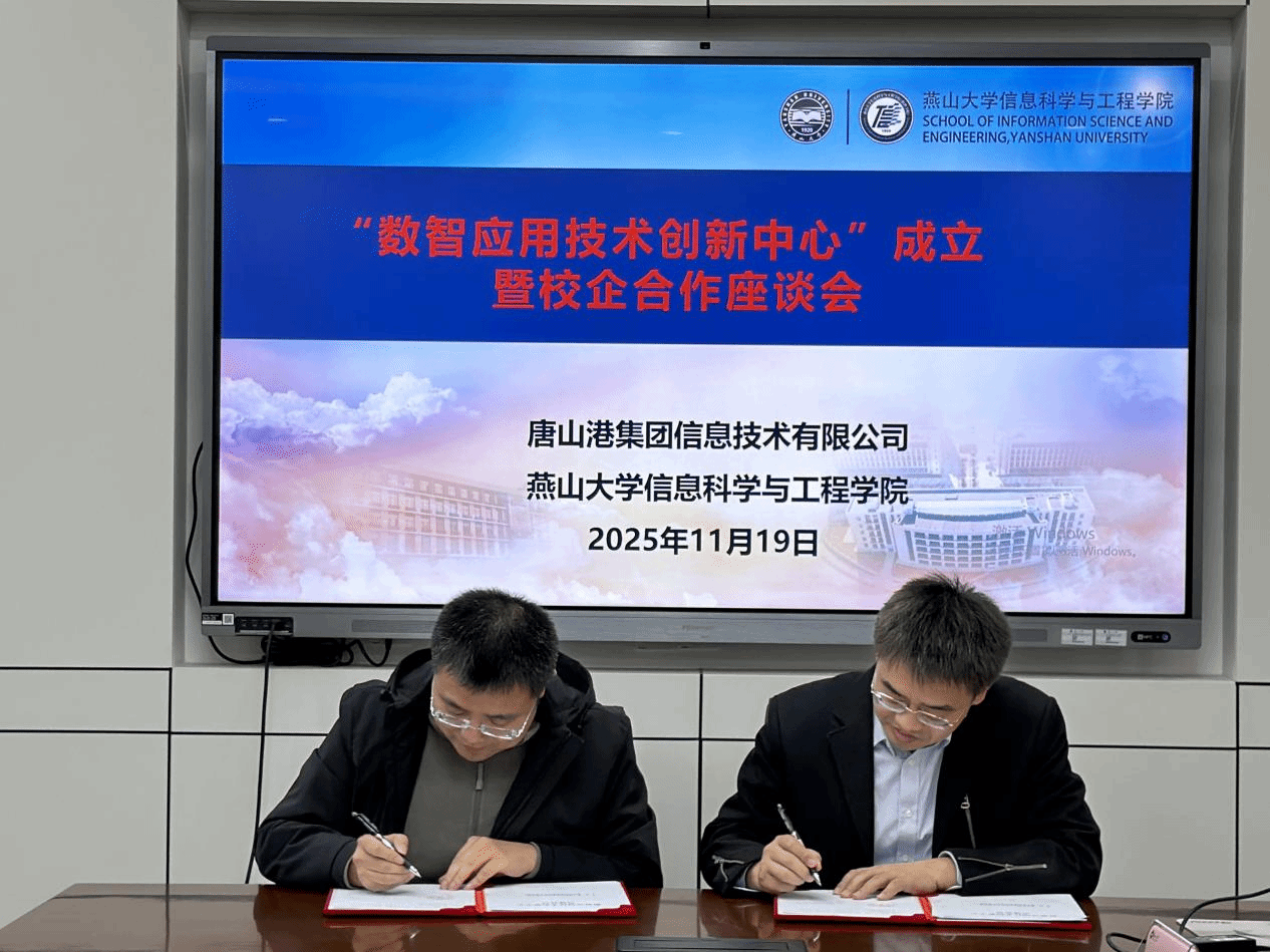 11月19日下午,信息科学与工程学院与唐山港集团信息技术有限公司举行“数智应用技术创新中心”共建签约仪式。唐山港集团信息技术有限公司经理任海涛、副经理侯安灰,河北港口集团有限公司专职董事、正高级工程师侯贵宾,以及信息科学与工程学院党委书记胡铁巍、院长齐跃峰、副院长顾广华等双方代表共同出席。仪式由齐跃峰主持。
