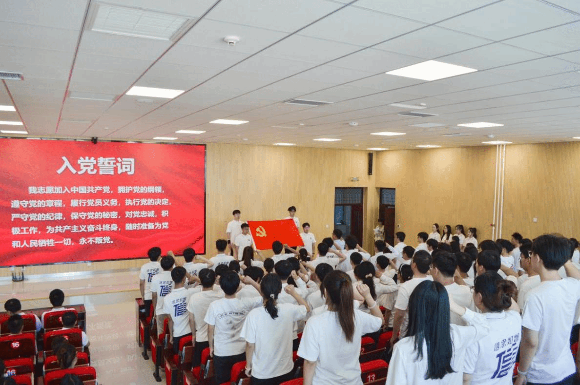 活动在庄严的《国际歌》中拉开序幕。首先李浩然宣读了学院党委会接收谷岳峰等90名同志为中共预备党员的决议。随后,元航等7位教师党支部书记郑重地为岳守义等新党员代表佩戴党员徽章,并发放《中国共产党章程》。新党员入党宣誓仪式承载着信仰的传承。在党委委员、副处级专职辅导员刘学才的领誓下,新党员面向党旗庄严宣誓,铿锵誓言响彻会场。