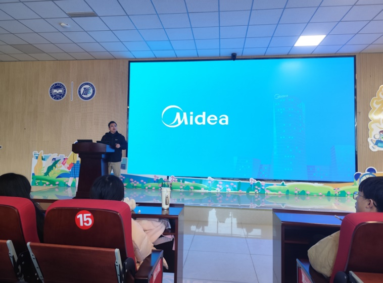 随后,计算机科学与技术专业2008 级校友代高明上台分享。代高明校友现任美的集团技术总监,同时也是燕山大学广州校友会秘书长。他为同学们全面梳理了美的集团的发展脉络,从创立之初的艰辛探索,到如今成为行业巨头的辉煌历程;展示了集团亮眼的业绩表现,剖析了多元化的业务板块,解读了高瞻远瞩的战略计划以及宏伟的愿景规划。在个人成长经验分享环节,代高明校友毫无保留地讲述了自己在大学期间如何确立目标、规划职业方向以及进行就业考量。他特别强调要秉持努力工作、认真生活的积极态度,鼓励同学们相信人生充满无限可能,只要坚定信念、不懈努力,未来定将更加美好。