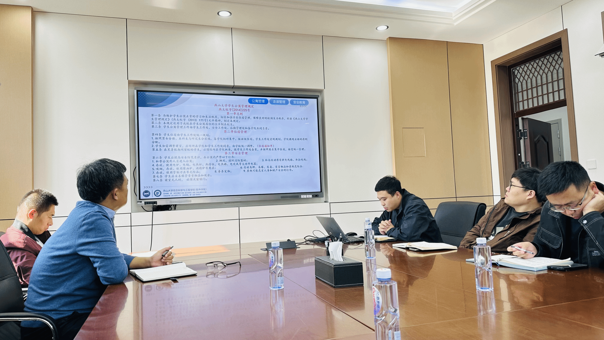 赵妍茹老师分享了“多向锻造式”的全过程网络思想政治活动方案、评奖评优流程、今日校园的使用。 王宇老师领学了《燕山大学学生心理危机干预实施细则》,并就大学生心理健康普测、心理危机的识别、防控、转介等工作进行分享。元航老师领学了《燕山大学学生公寓管理规定》、《燕山大学学生走读管理规范》、安全教育工作的内容。