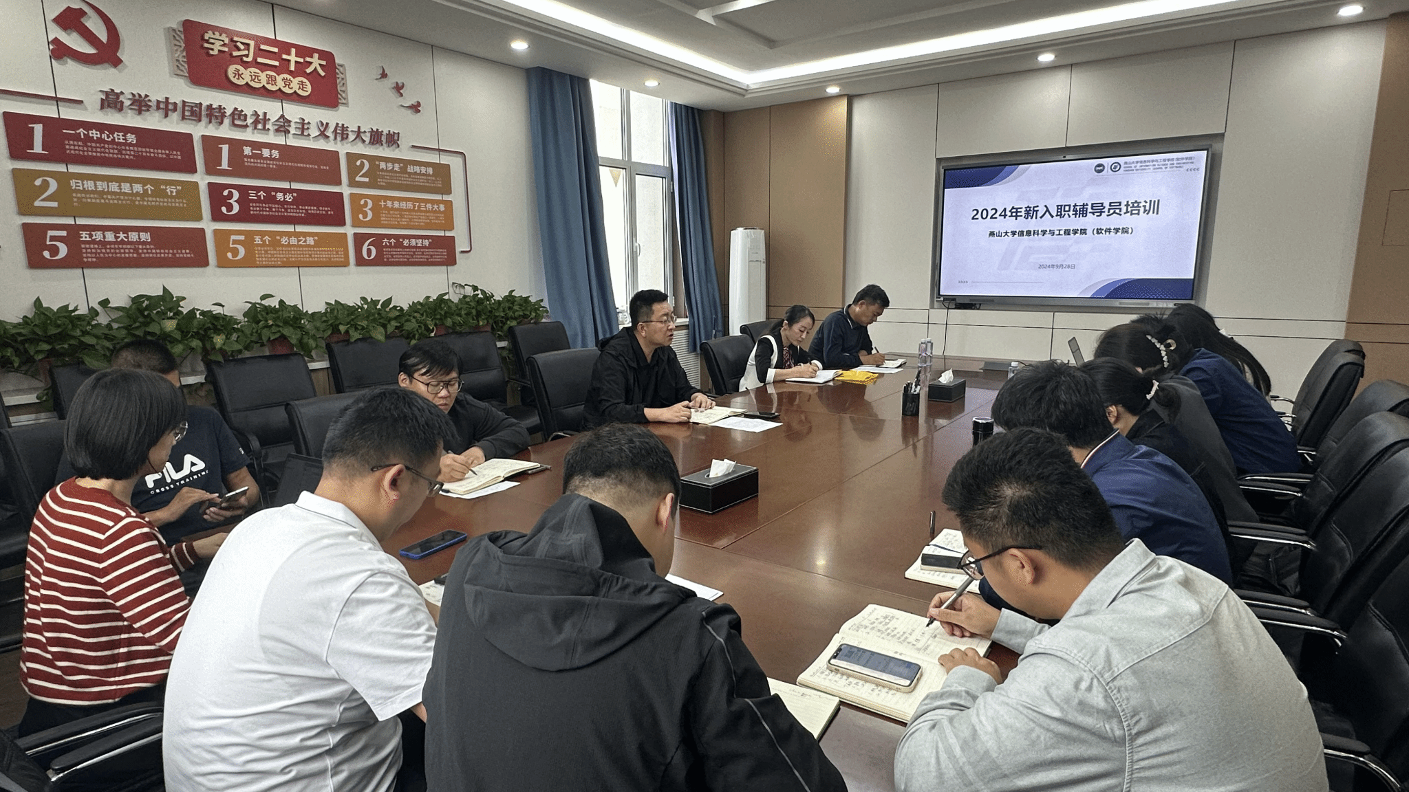 宋江涛老师对学院就业工作情况进行介绍,重点围绕近三年就业情况、2024届就业工作情况及常见问题展开。朱明骥老师结合燕山大学本科生、研究生以及其他资助政策,为如何做好学生资助工作指明了方向。