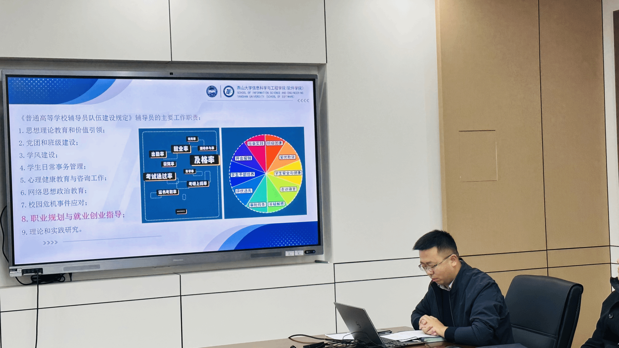 刘学才老师对《燕山大学辅导员考核评优实施细则》等文件进行解读,结合实际工作经验与大家分享学生工作的建议。孟宪源老师从国防征兵、科技创新、学生证办理、基本医疗保险等方面进行分享。
