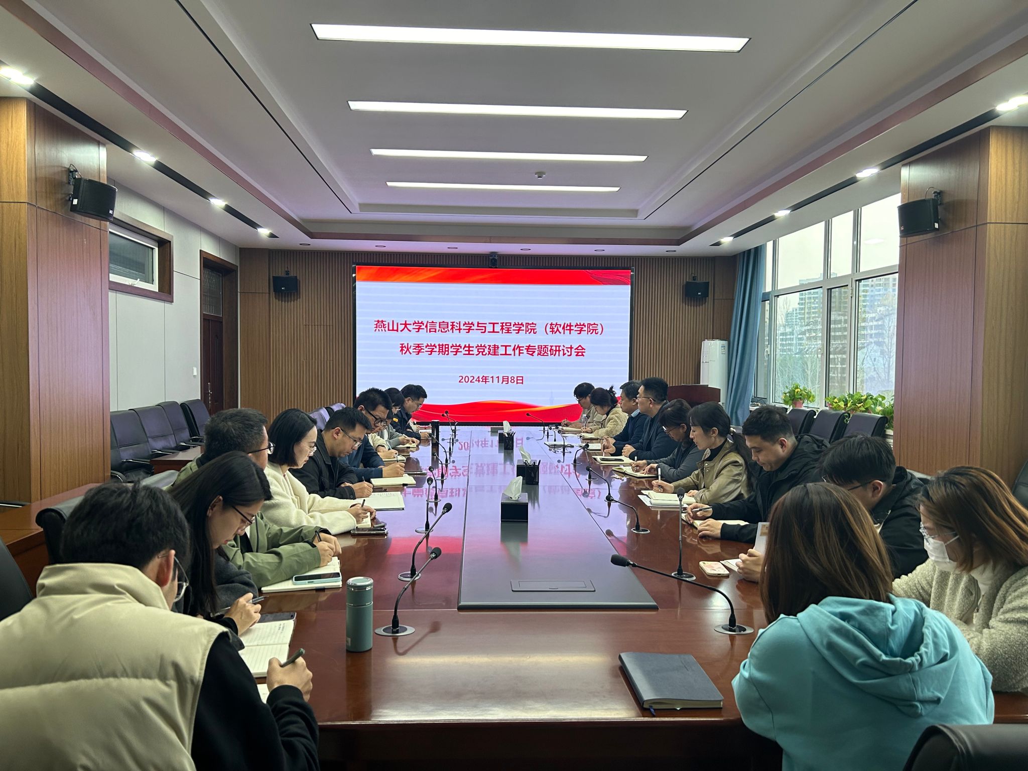 为进一步加强基层党组织建设,提升学院学生党建工作质效,11月8日下午,信息科学与工程学院(软件学院)党委在信息馆1号楼336室召开秋季学期学生党建工作专题研讨会。学院党委书记胡铁巍、副书记李浩然、正处级专职辅导员苏静、副处级专职辅导员刘学才及全体学生党支部书记参加会议。会议由李浩然主持。
