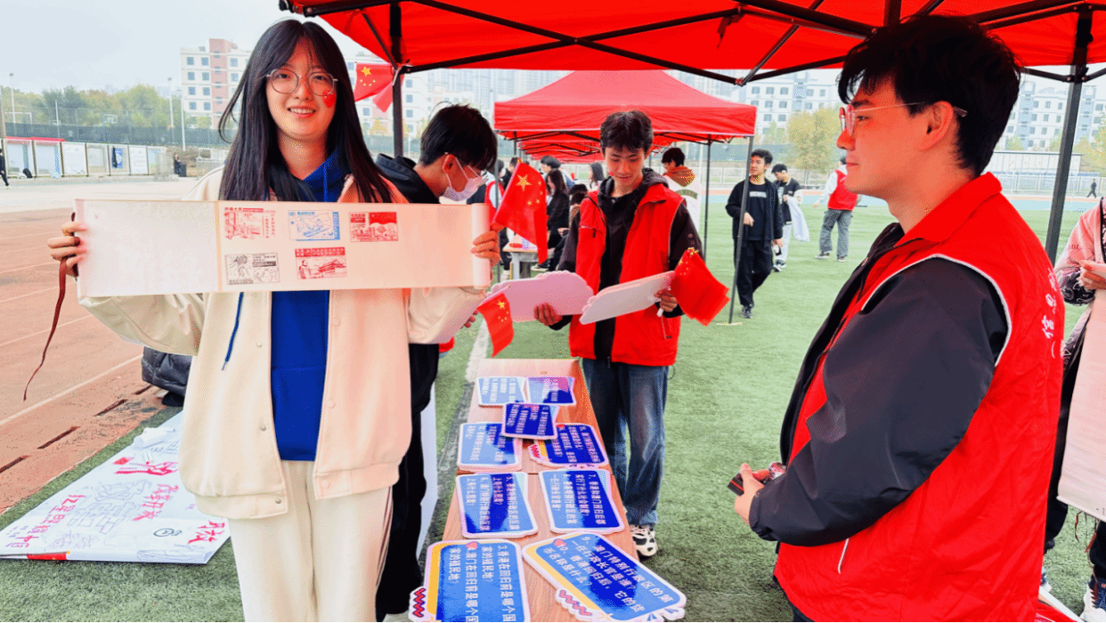 “‘一国两制’实践推进祖国统一”,第五枚主题印章“港澳回归”巧妙融入“紫荆花”与“金莲花”视觉元素,象征着在“一国两制”实践中,港澳归宗后如同盛开花朵般绽放。点位以科普问答方式向师生普及了丰富的国情知识,深化学子们对祖国统一地坚定追求和美好祝愿,促使学子们更加积极主动地承担起维护国家统一、推动国家发展的责任,为祖国发展贡献青年力量。