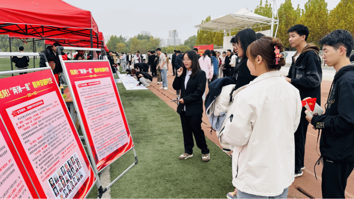 “从原子弹到氢弹,用2年8个月震撼世界”,在第二枚印章“中国第一枚原子弹爆炸”的主题点位中,学子们在主持人的讲解下,共同观看“铭刻!‘两弹一星’精神穿越时空”主题展览,了解先辈在艰苦条件下创就的伟大成就,感受中国共产党人精神谱系内蕴藏的巨大能量,让“两弹一星”精神在新时代接力传承。