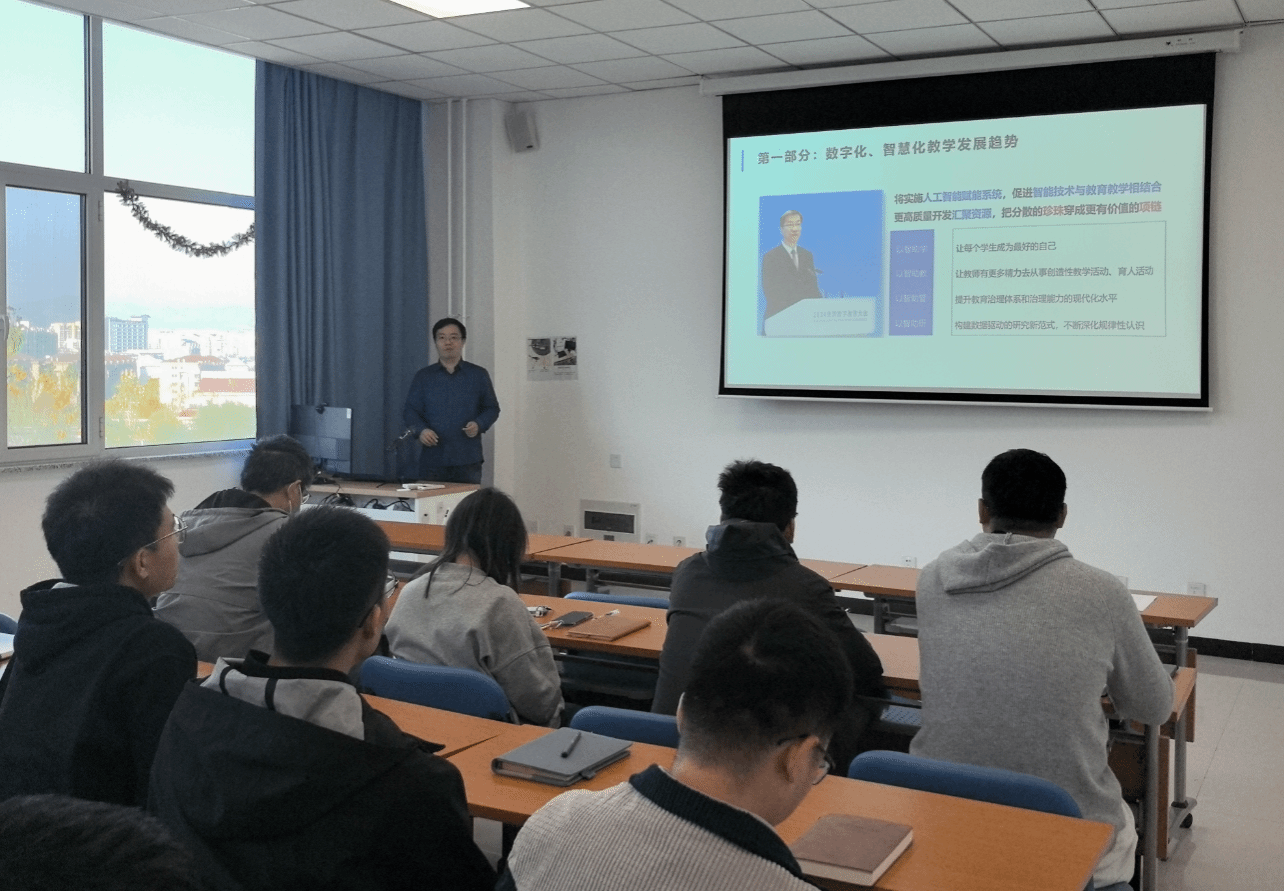 刘烁老师首先分析数字化、智能化教学发展趋势,对人工智能辅助高校课程建设的最新进展进行介绍,并分享了国内外在该领域的研究成果。然后,刘老师详细介绍了智能教学系统、个性化学习、智能评估与反馈等AI技术在教学中的应用,并展示了如何通过智能化教学平台进行学情分析和知识图谱构建,以实现教学内容和方法的创新。培训案例分析通俗易懂,自我反思切合实际,受到与会教师的一致好评。
