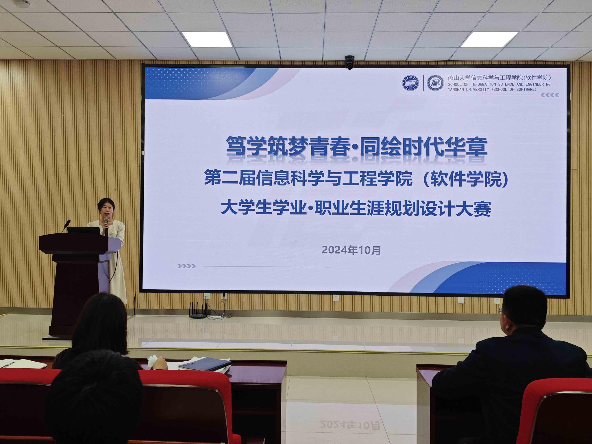 为全面落实立德树人根本任务,加强大学生学业和职业生涯规划教育与实践,引导大学生树立正确的学职生涯规划意识,科学合理地规划大学学习与生活,提高大学生职业素养和能力,展现新时代青年的风采与担当,为中华人民共和国成立75周年献礼,信息科学与工程学院(软件学院)于10月24日在信息馆2号楼行知报告厅举办了第二届大学生学业·生涯规划设计大赛决赛。学院党委副书记李浩然出席了本次活动,2024级本科生辅导员任旭、孟宪源、李萌以及3名推免成功的大四学生担任大赛评委,2024级部分本科生学生代表观摩了本次大赛。