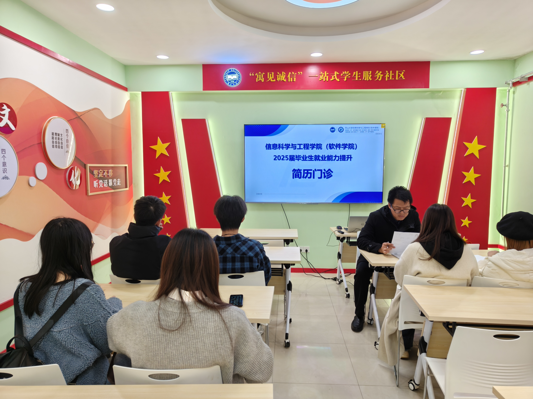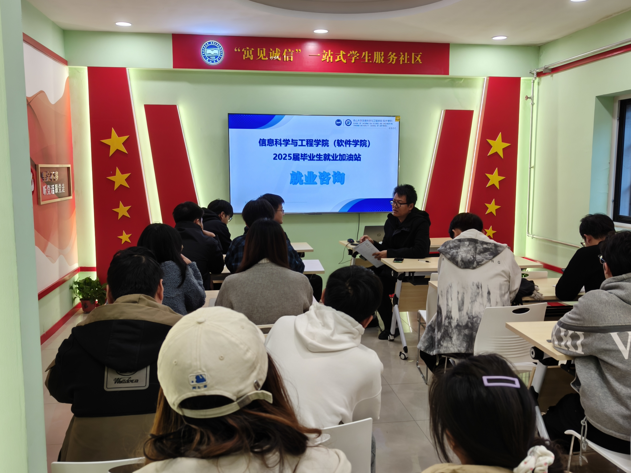 为推动学院就业工作开展,进一步提升毕业生求职竞争软实力,帮助学生提高制作求职简历的技能和水平,明晰就业方向,10月24日下午,信息科学与工程学院(软件学院)在“寓见诚信”一站式学生社区举办2025届毕业生就业加油站,开展就业咨询与简历指导,贾永伟和宋江涛2位老师倾情“坐诊”,为毕业生点对点提供就业服务。