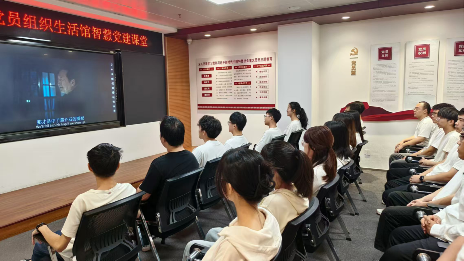 看一场红色电影,重温往昔峥嵘岁月。学员们在组织生活馆智慧党建课堂中,集体观看了红色影片《建国大业》,回顾中华人民共和国成立前夕,中国人民在中国共产党领导下所经历的艰苦卓绝的斗争和辉煌历程。电影中无数革命先辈们坚定信仰、英勇斗争、敢于牺牲的精神,给学员们带来了极大地震撼和感动,他们深刻感受到革命的艰辛与胜利的来之不易。学员们纷纷表示要铭记历史,缅怀先烈,传承红色基因,厚植报国之心,以实际行动为祖国的繁荣富强贡献青春力量。