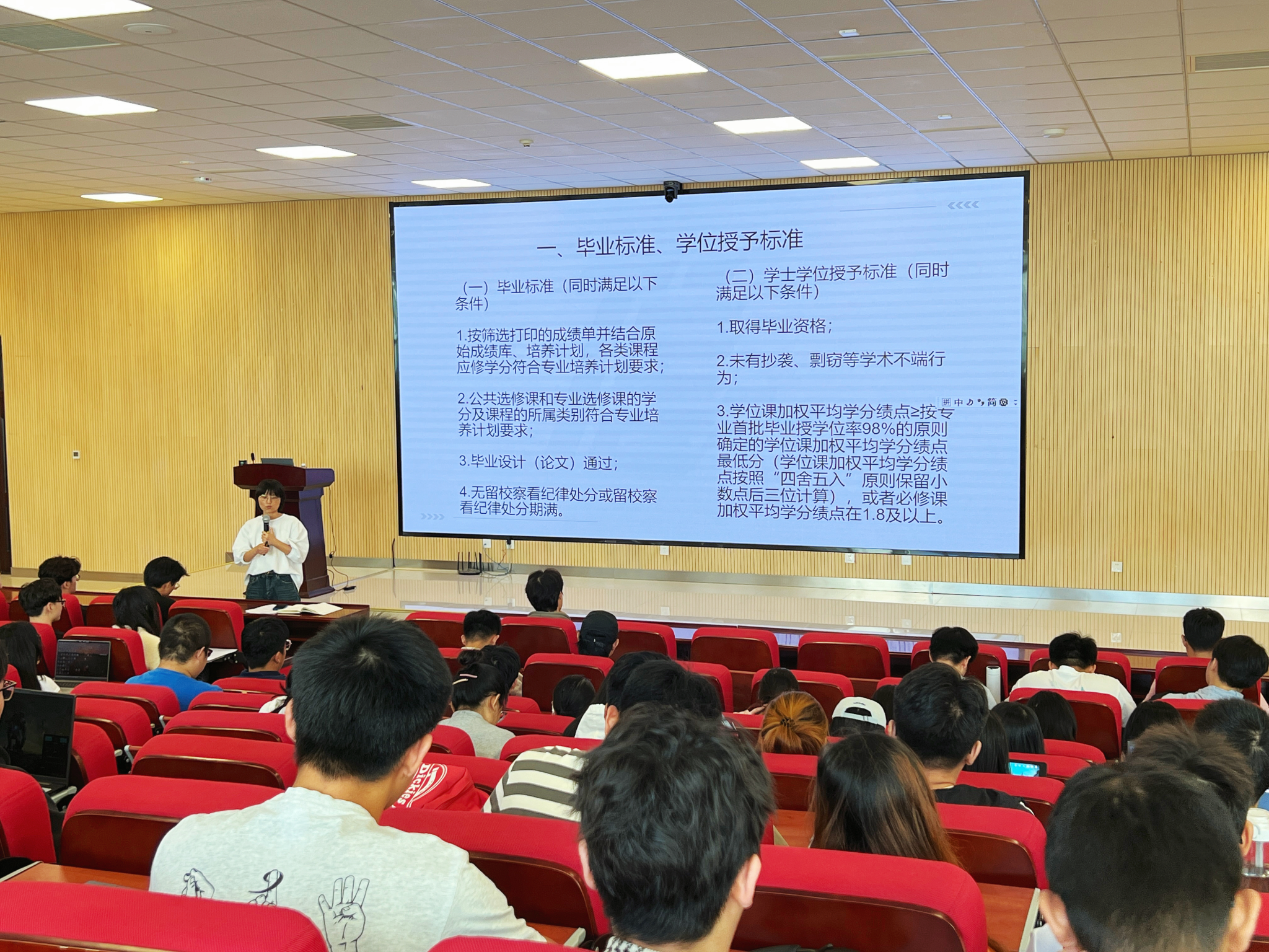 李围从毕业及学位授予标准、专业培养学分、遵规守纪、毕业生的就业心态进行讲解,希望同学们对标毕业条件,合理制定职业规划,提高就业心理素质和应对能力。