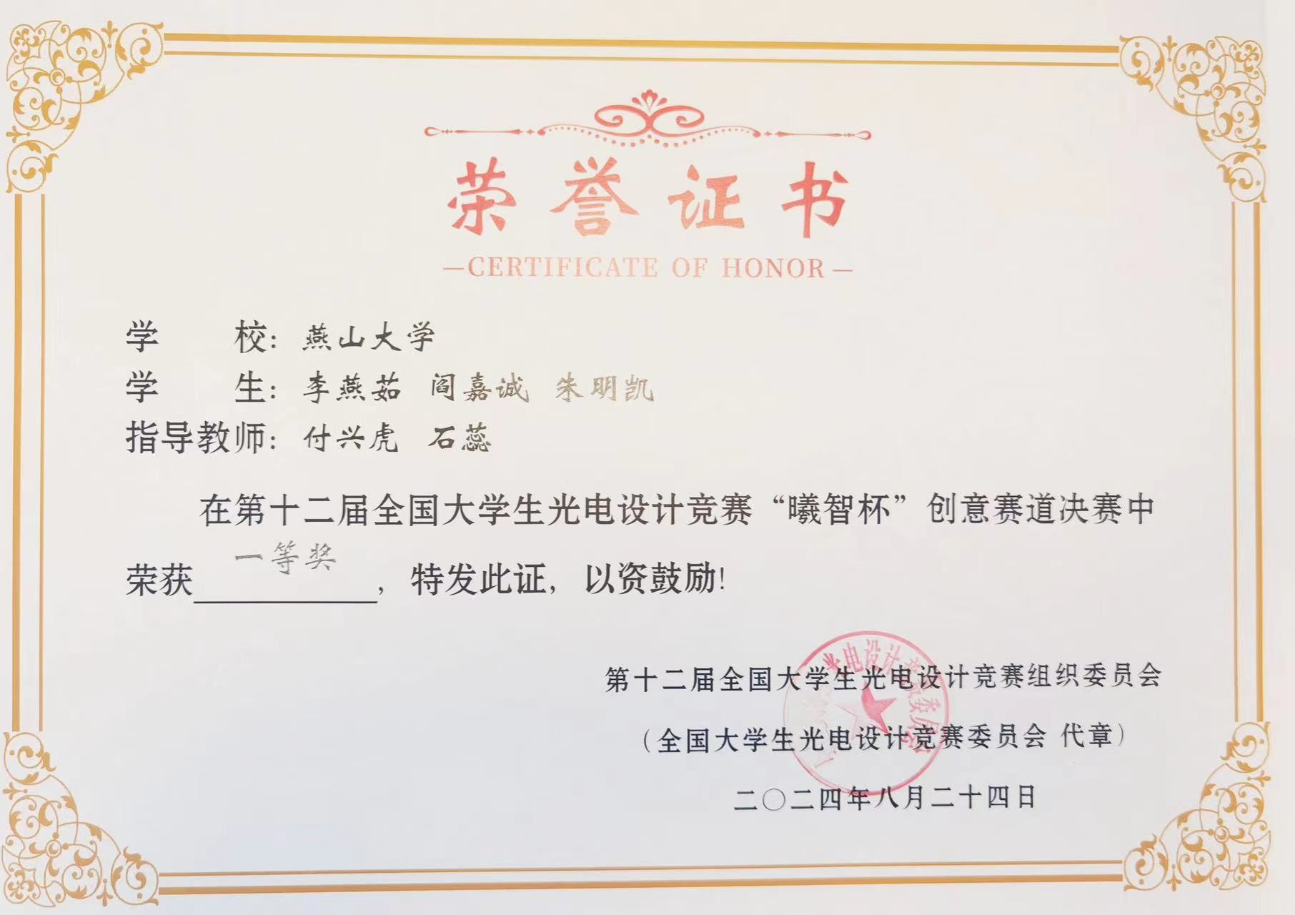 近日,第十二届全国大学生光电设计竞赛“曦智杯”创意赛道决赛在西安电子科技大学举办。我校参赛团队奋力拼搏,再创佳绩,获得全国一等奖2项,三等奖2项。我校获得的一等奖数量位居华北地区高校首位,连续7年荣获国赛优秀组织奖!付兴虎、石蕊两位老师获得优秀指导教师奖。
