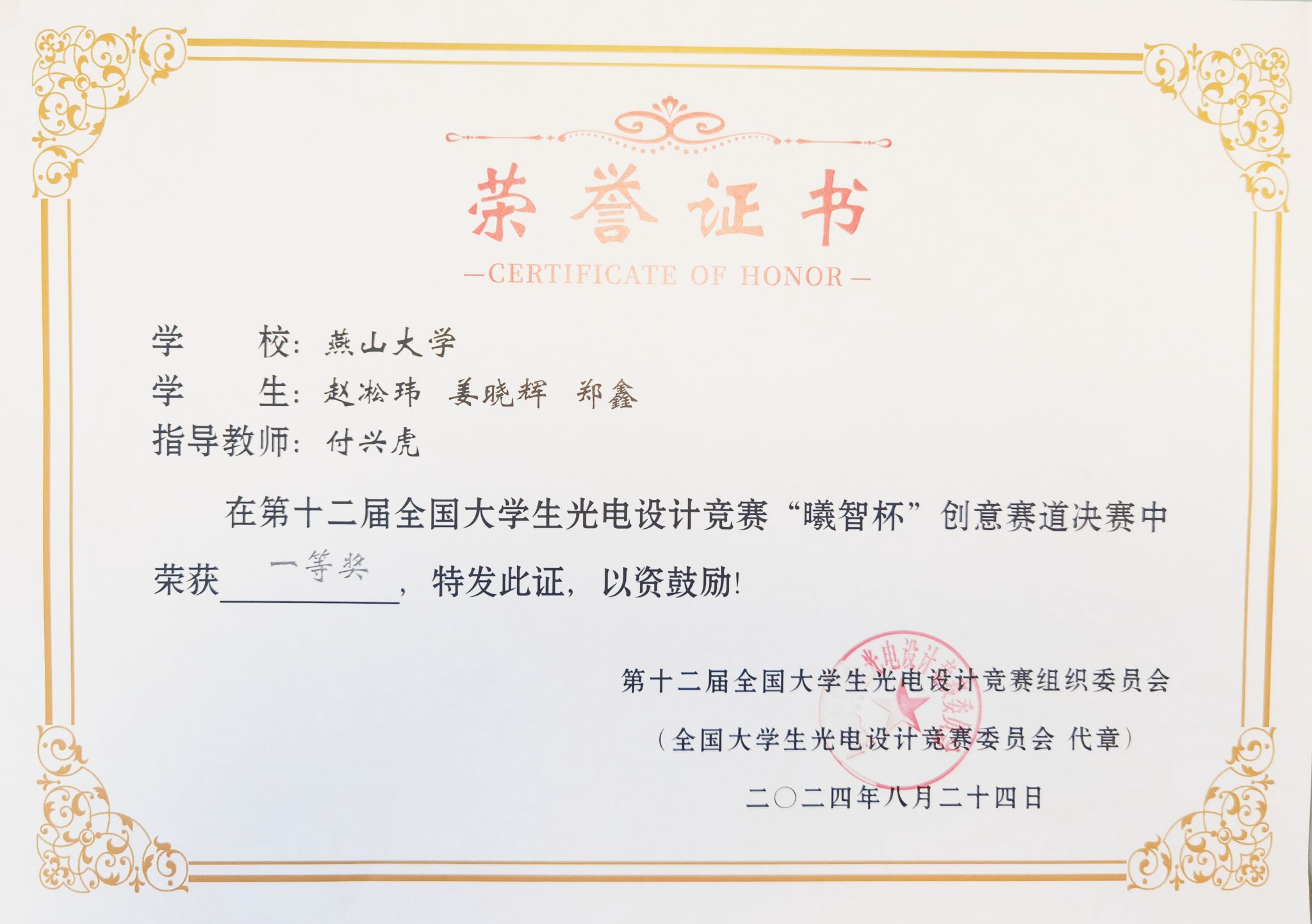 一等奖荣誉证书