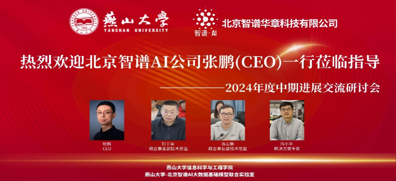 8月25日,北京智谱华章科技有限公司(简称“智谱AI”)CEO张鹏一行4人来访燕山大学指导交流,参加“燕山大学-智谱AI大数据基础模型联合实验室”(简称“联合实验室”)2024年度中期进展交流研讨会。河北地质大学校长、联合实验室管委会主任任家东,信息科学与工程学院院长齐跃峰,信息科学与工程学院副院长王林,联合实验室主任刘文远等出席欢迎仪式。