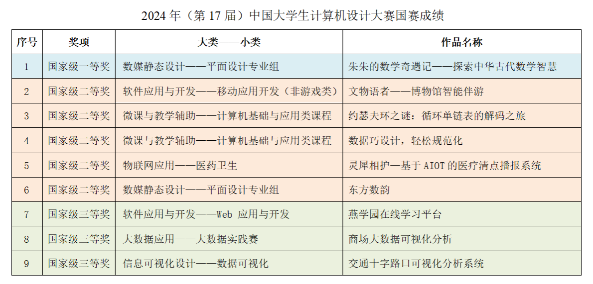 近日,历时半年多的2024年(第17届)中国大学生计算机设计大赛国赛圆满落下帷幕,我校在本届大赛国赛中再次喜获佳绩,共获得国家级一等奖1项、二等奖5项、三等奖3项。