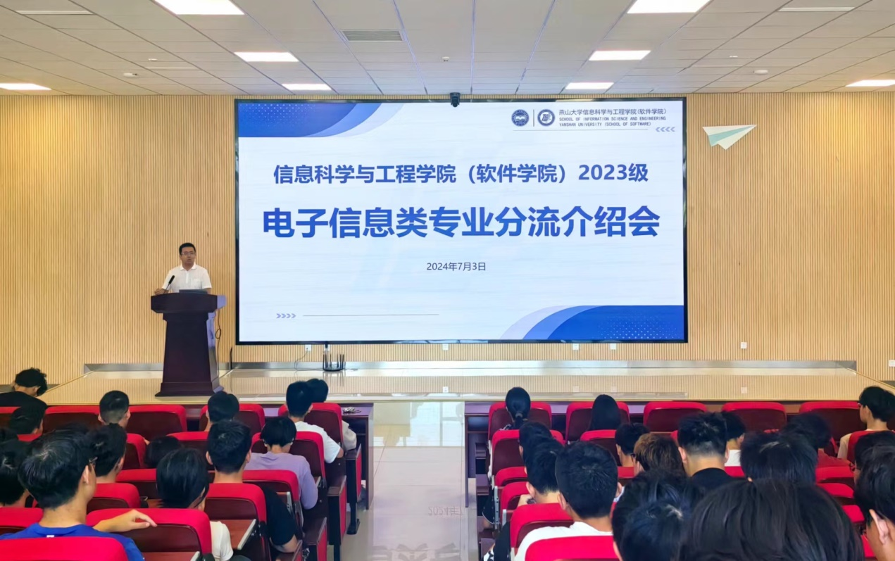 为做好学院2023级电子信息类专业分流工作,帮助同学们立足个人兴趣,锚定发展方向,理性选择专业,以崭新的精神面貌投入大类分流后的专业学习,7月3日上午,学院在信息馆2号楼行知报告厅组织召开2023级电子信息类专业分流介绍会。介绍会邀请电子与通信工程系主任张涛、光电子工程系副主任刘烁两位老师对专业情况进行深度解读,2023级电子信息类全体学生参会。会议由本科生辅导员宋江涛老师主持。