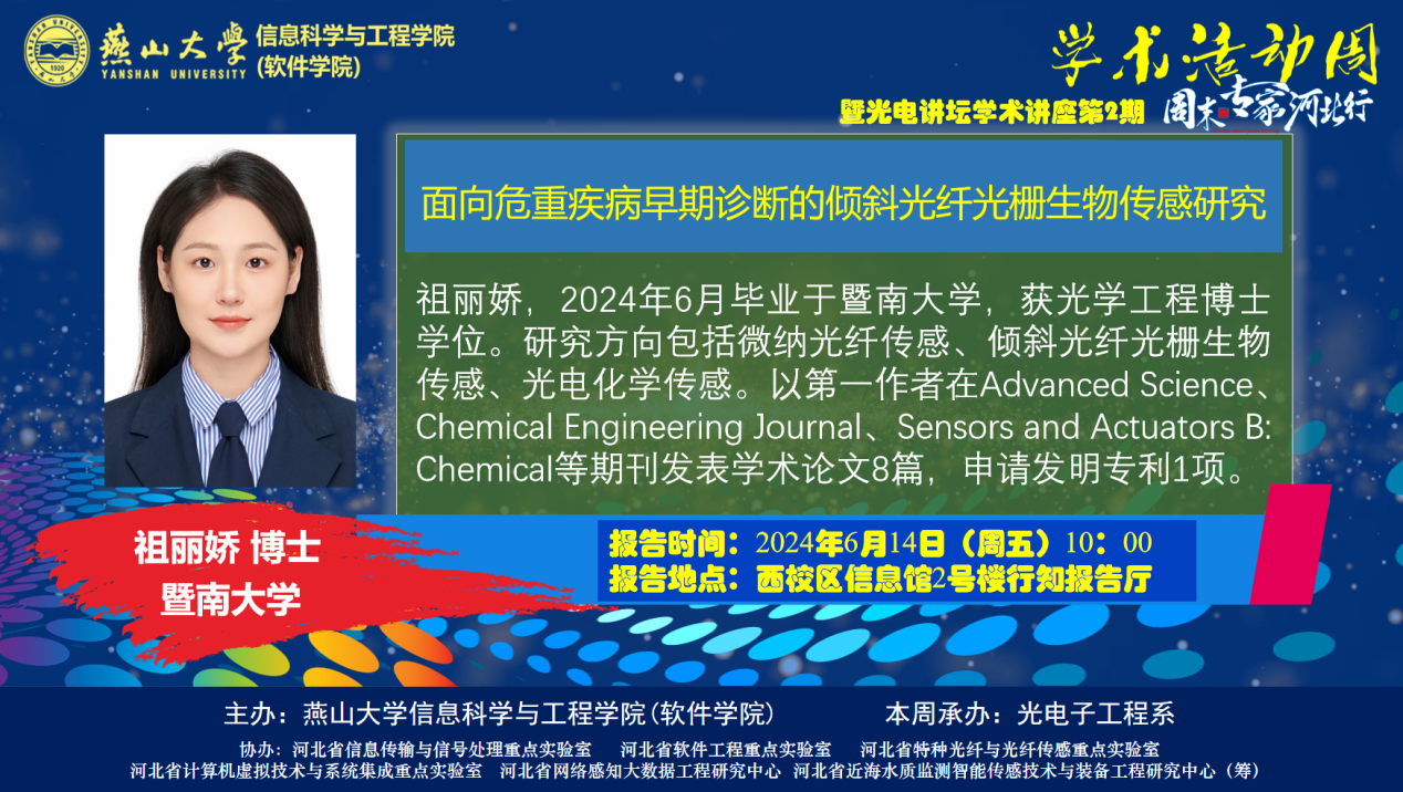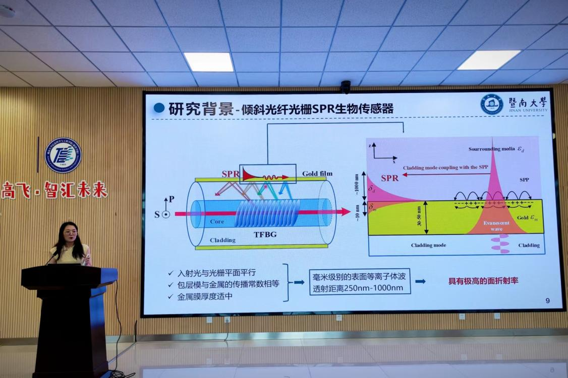 活动中,祖丽娇博士以《面向危重疾病早期诊断的倾斜光纤光栅生物传感研究》为题,聚焦于光纤传感器件,深入挖掘倾斜光纤光栅传感器的模式机理,提出光谱多参量解耦机制,并将光纤传感技术拓展至医学疾病早期检测研究领域,实现了生物分子多参量原位区分测量。