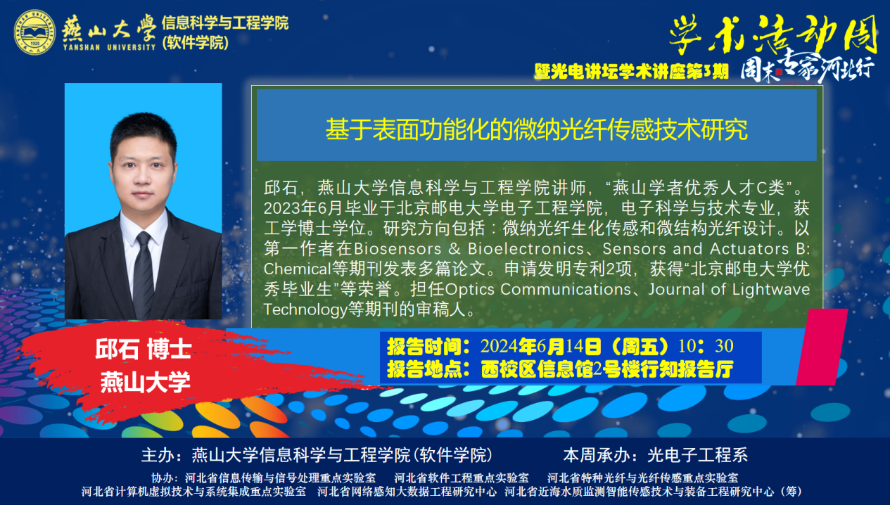 6月14日,信息科学与工程学院(软件学院)“学术活动周”第九期暨“周末专家河北行”活动在学院行知报告厅举行。活动邀请暨南大学祖丽娇博士和燕山大学邱石博士作学术报告。本次活动由信息科学与工程学院主办,光电子工程系承办。