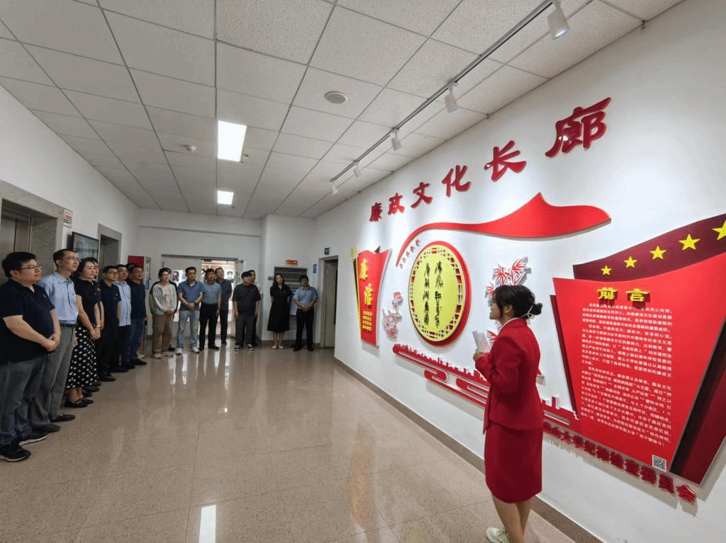 讲解员详细介绍了“清风弥万世 廉韵润燕园”为主题的廉政文化长廊。廉政文化长廊由1个序厅、4个主展区和9个分展区组成。包括“栉风沐雨 砥砺前行”等9个分展区,展区更新完善了《中国共产党纪律处分条例》、警示案例、忏悔录、纠治“四风”等展陈内容及数据;增加了电教板块、实物展陈、党纪学习教育画展等内容。