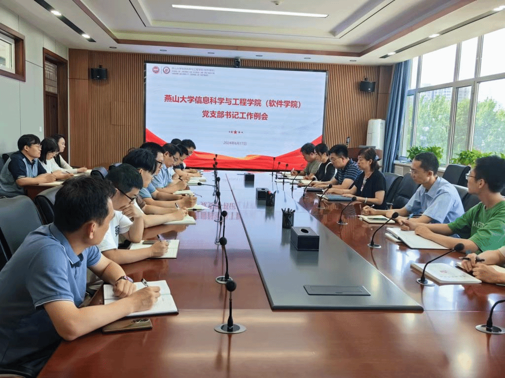 为了深入学习贯彻习近平新时代中国特色社会主义思想与党的二十大精神,推进党纪学习教育走实走深,6月17日,信息科学与工程学院(软件学院)召开党支部书记工作例会。学院党委书记胡铁巍、党委副书记李浩然、正处级专职辅导员苏静、副处级专职辅导员刘学才以及学院各党支部书记参加了会议。会议由党委副书记李浩然主持。