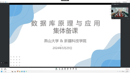 为全面贯彻习近平新时代中国特色社会主义思想和党的二十大精神,深入贯彻习近平总书记关于教育的重要论述,进一步深化对口支援高校的全面合作,按照燕山大学信息科学与工程学院(软件学院)与新疆科技学院信息科学与工程学院党总支共建行动清单工作要求。5月29日下午,双方在共建课程和共建内容前期充分沟通的基础上,开展《数据库原理与应用》集体备课研讨会。燕山大学信息科学与工程学院(软件学院)软件工程系教师王晓妍为本次集体备课研讨会的主讲人,新疆科技学院数据库课程组全体教师参加集体备课研讨会。