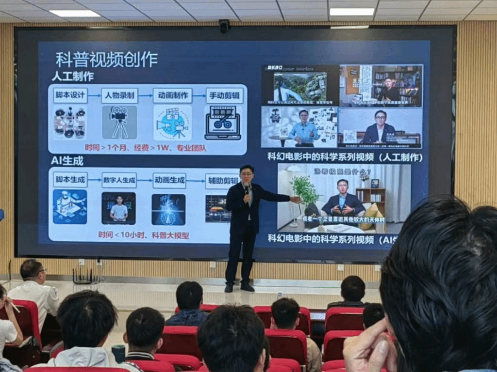 王元卓校友以《当科学幻想照进现实》为主题作了一场精彩的报告,报告从科学幻想与科学研究之间的联系入手,结合自身担任科幻电影《流浪地球2》科学顾问的经历介绍科幻电影中的科学,并结合ChatGPT和Sora的发展和应用,分析生成式人工智能的特点和面临的挑战。最后,他根据自己当前的科研工作,介绍了生成式AI驱动的个性化科学教育的研究框架和应用探索。