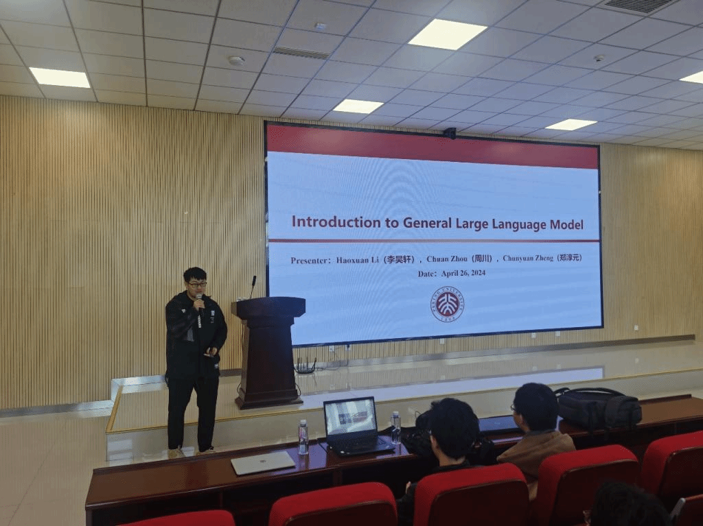 下午,李昊轩带领团队成员郑淳元、周川做了题为《大语言模型与因果推理》的报告,围绕能够处理多种任务和领域的通用大语言模型(例如BERT、GPT等)的前沿研究课题进行介绍,讨论通用大模型的技术基础(BERT、GPT、T5 模型、专家混合模型、基于检索的模型)、新兴能力(知识、推理、少量学习、上下文学习)、微调和适应、系统设计以及安全性和伦理。并深入讨论大语言模型和因果推理的结合,讨论了如何借助微调技术使得大语言模型能够回答因果问题,发掘变量之间的因果联系,从而帮助人类做出更加精细和个性化的决策。