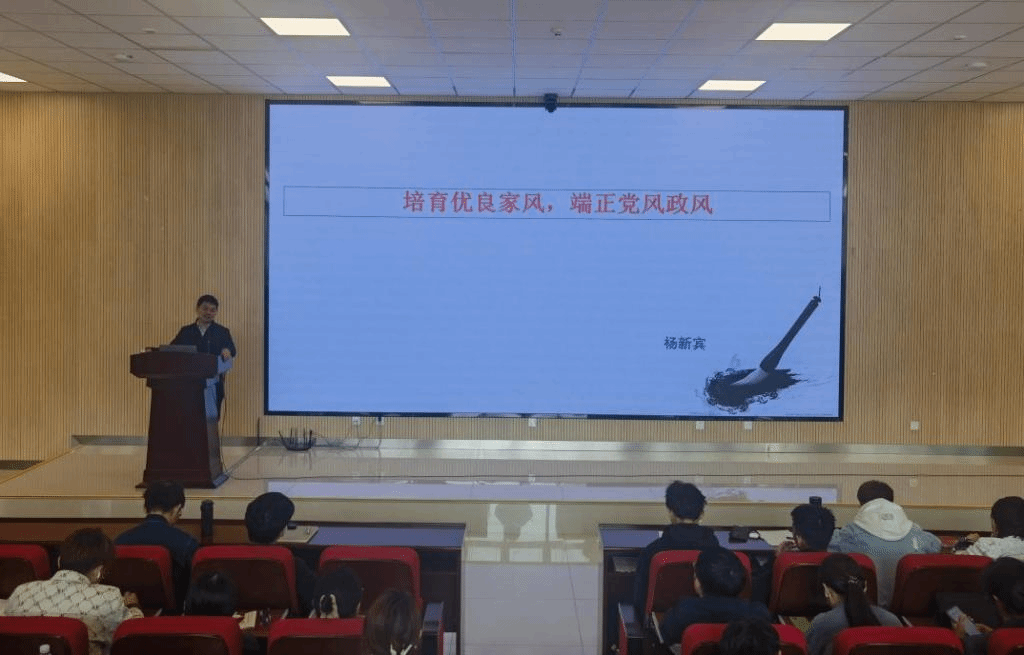 杨新宾老师作题为《培育优良家风,端正党风政风》专题辅导报告。杨老师从历史典籍出发,结合现实背景和故事,阐述了家庭与家风的含义,在我们的社会中,家庭是最基本的单位,家风则是家庭的风气和风尚。杨老师从家风可以折射出党的性质宗旨、注重家风是中国共产党人的优良传统、家风败坏是问题干部的重要表现三个方面阐释了家风与党风政风之间存在着内在的逻辑关系,指出家风的好坏直接影响到党风政风的形成和发展。因此,以家风涵育党风政风,是我们深化家庭教育,塑造良好社会风尚的重要路径。报告最后,杨老师深刻指出,只有坚定信仰、无私为公、严管厚爱、洁身自好、不逾底线,方能涵育党风政风。