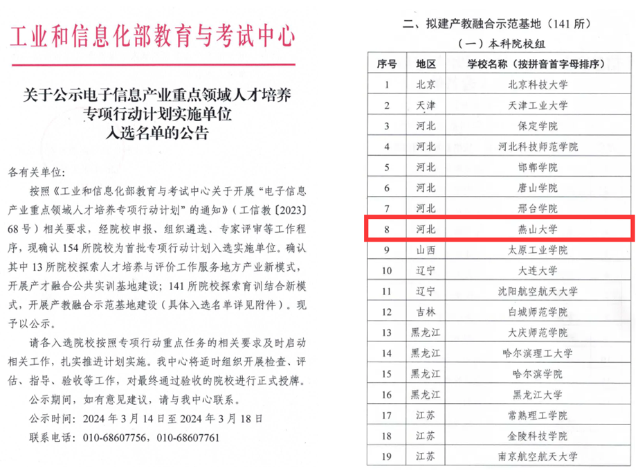 近日,工业和信息化部教育与考试中心发布《关于公示电子信息产业重点领域人才培养专项行动计划实施单位入选名单的公告》,燕山大学以信息科学与工程学院电子与通信工程系电子信息工程专业为支撑,经过院校申报、组织遴选、专家评审等环节,成功入选首批电子信息产业重点领域人才培养专项行动计划实施单位。本次评选共有141所院校入选产教融合示范基地,其中本科院校有87所。