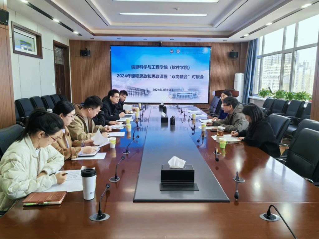 为深入落实教育部《高等学校课程思政建设指导纲要》、教育部等十部门《全面推进“大思政课”建设的工作方案》要求,推进党的二十大精神进课堂、进头脑,进一步推动各类课程与思政课同向同行,提升课程思政工作成效,3月15日下午,信息科学与工程学院(软件学院)与马克思主义学院在信息馆1号楼336室联合开展2024年课程思政与思政课程“双向融合”对接会。马克思主义学院思政课教师团队、学院第四批课程思政示范课程建设项目负责人、各系教学副主任及教务科相关老师参与对接会,本次会议由教学院长顾广华主持。