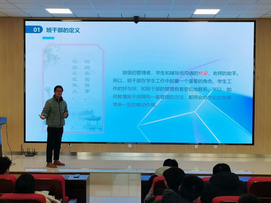 会上,贾永伟强调了班级干部在班级建设、学术引领、文化传承以及和谐安全校园构建等方面的重要作用。结合自身在辅导员岗位上的实践经验,就如何高效沟通、科学决策、策划实施各类活动以及解决实际问题等方面进行了深入浅出的讲解,引导班级干部学会处理复杂问题,增强团队凝聚力。