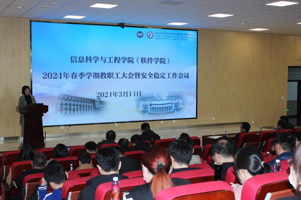 3月14日下午15:00,学院在“行知”学术报告厅召开2024年春季学期教职工大会暨安全稳定工作会议。学院领导班子成员和全体教职工参加会议,会议由学院党委书记胡铁巍主持。