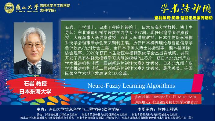 3月12日信息科学与工程学院(软件学院)“学术活动周”第五期活动暨第11届北戴河——知识——智能论坛在学院行知报告厅举行。活动邀请燕山大学杰出校友、讲座教授、日本工程院外籍院士、日本东海大学石岩教授作学术报告。本次活动由信息科学与工程学院主办,软件工程系承办,学院副院长王林教授主持。