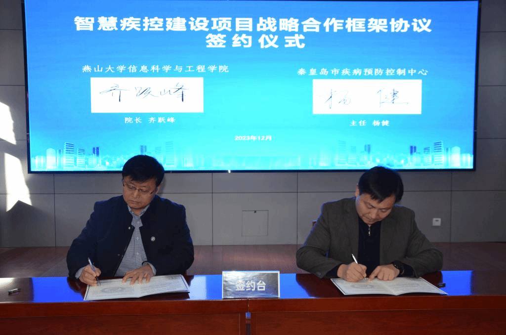 12月20日,秦皇岛市疾病预防控制中心和燕山大学信息科学与工程学院在秦皇岛市疾病预防控制中心举行智慧疾控建设项目科研合作签约仪式。燕山大学信息科学与工程学院(软件学院)党委书记胡铁巍、院长齐跃峰、副院长顾广华、电子信息与通信工程系主任张涛、支部书记李朝辉、副主任李玉博;市卫健委党组成员、副主任、市疾控局局长、市疾控中心主任杨健,市卫健委四级调研员魏金民,市卫健委一级主任科员王敬东,规划信息科科长张文涛及市疾控中心中层及以上干部出席签约仪式。