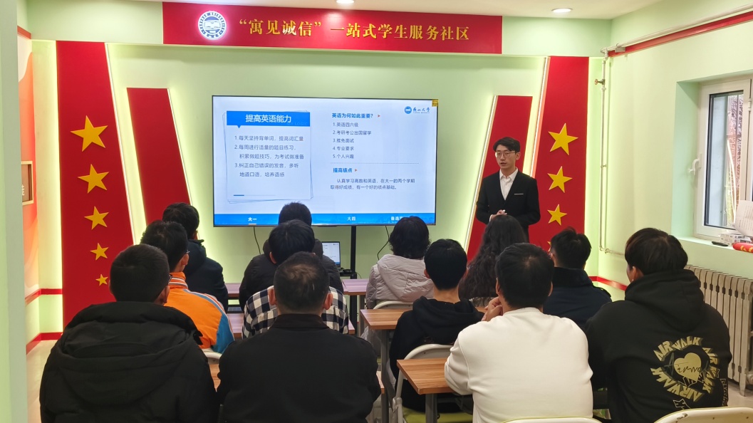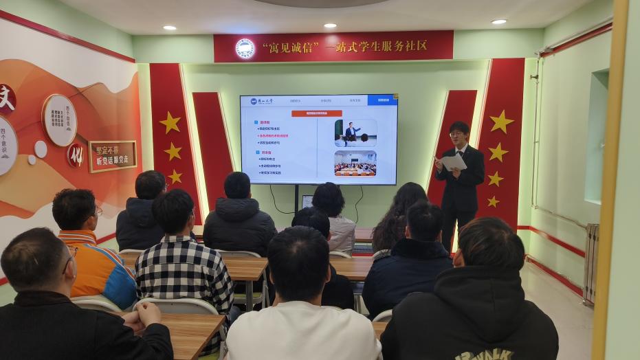 辅导员孟宪源对一站式学生社区及学生功能型党支部的建设情况向与会人员做了简要介绍,一站式学生社区以“寓”见诚信为主题,聚焦大学生诚信教育,以党建工作领航,将充分发挥诚信学风,诚信就业教育功能,满足社区内学生多元化、个性化的需求。功能型党支部将立足新阵地,把党建引领贯穿于学生社区“一站式”建设的全过程、全方位,积极探索党建引领在学生社区的立体支撑和延展下沉的新方法。