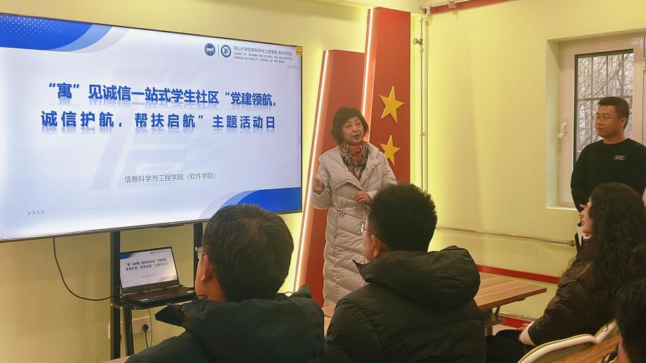 为进一步增强大学生诚信意识,培育学院优良学风建设,发挥党建领航功能,12月14日,信息科学与工程学院“寓”见诚信党支部在一站式社区举办了“党建领航,诚信护航,帮扶启航”主题活动。学院党委书记胡铁巍、党委副书记李浩然、正处级专职辅导员苏静、副处级专职辅导员刘学才以及部分辅导员代表,“寓”见诚信党支部学生党员代表参加了活动。