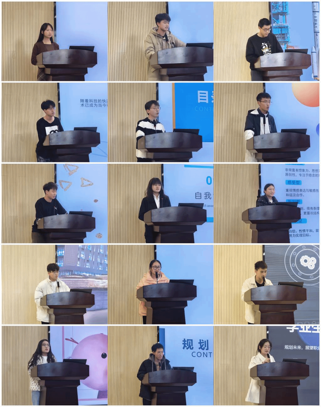 经过前期各班级的初选推荐,共有15位选手进入现场答辩环节,参赛选手依次进行了学业生涯规划的展示,分别从自我认知、专业认知、环境分析、学业规划以及实施方法等方面进行阐述,呈现出条理清晰的学业规划和拼搏向上的青春风貌,不仅带来了对学业规划独特的见解和思考,也为在场的同学们提供了值得借鉴的学习经验。比赛现场气氛热烈,高潮迭起。