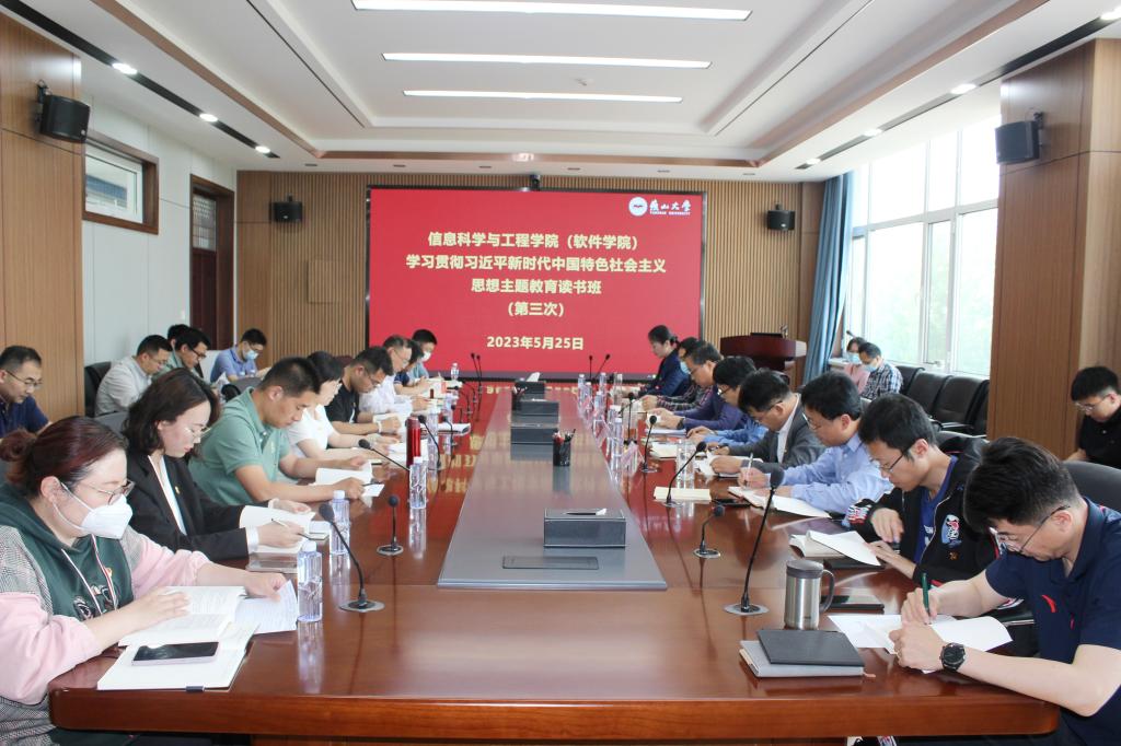 5月25日下午,信息科学与工程学院(软件学院)党委在学院一号楼336室开展学习贯彻习近平新时代中国特色社会主义思想主题教育读书班第三次集中研学。本次集中研学由学院党委书记王昕主持,学院班子成员、科级秘书、党支部书记、系主任、辅导员参加。