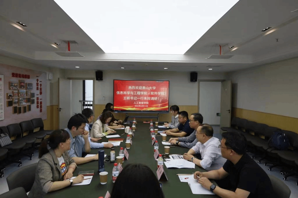 4月11日下午,走访西南大学人工智能学院,座谈会由人工智能学院党委书记夏俊主持,副院长胡小方,智能科学系系主任陈枫,人工智能系教授徐伟华,学院教工第一党支部书记张晓燕,学院教工第二党支部书记潘东波,学院研究生秘书李雪参加了座谈会。座谈会上,大家重点围绕党建工作、人才引育、学科团队建设、国际化教育、校企合作等方面进行了充分的交流。会后,调研团成员一行在徐伟华教授的陪同下参观了学院部分研究生课题室,了解了研究生培养及研究生管理等方面的具体做法。