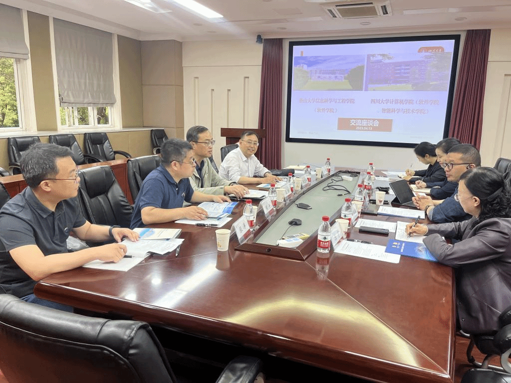 随后,王昕书记一行来到了四川大学计算机学院(软件学院、智能科学与技术学院)走访调研,副院长严斌宇,院专职组织员、行政党支部书记郝清华,学院工会主席陈媛媛,研究生科科长陈宇,党政办副主任张飞絮参加了座谈会。会议由副院长严斌宇主持,严斌宇从学科建设、专业建设和师资队伍建设三个方面做了详细介绍。双方就国际合作联合培养、双学位教学管理、本科生招生、工程教育认证、教学与科研平衡发展等方面的问题进行了交流。