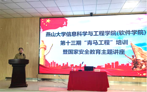 4月15日是第八个全民国家安全教育日,为深入贯彻习近平总书记“总体国家安全观”这一重大论断和战略安排,增强同学们的国家安全意识,4月13日下午,信息学院团委在信息馆二号楼学术报告厅举办2023年“青马工程”首场培训暨国家安全教育主题讲座。讲座由信息科学与工程学院(软件学院)党委副书记苏静主持,学院党委特别邀请秦皇岛市国家安全局专家为青马学员授课。
