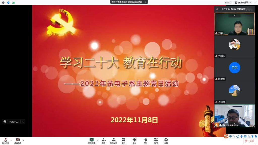 11月8日,信息科学与工程学院(软件学院)光电子工程系党支部组织开展专题党课学习党的二十大精神。党课以党的二十大通过的《中国共产党章程(修正案)》中修改的50处内容为切入点,通过新旧版本对照,认真学习研读新党章。