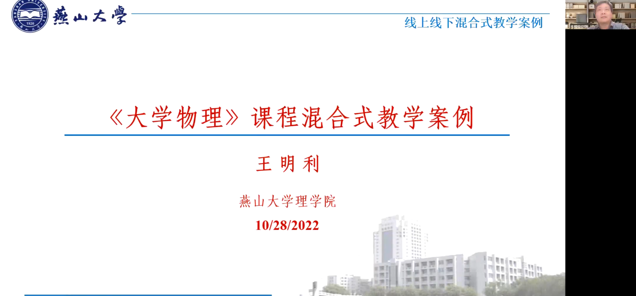 培训会中,王明利老师以“《大学物理》课程混合式教学案例”为题,结合多年的教学改革经验为与会老师详细介绍大学物理线上线下混合式教学改革的全过程,分享混合式教学改革的经验及取得的成果。他强调,线上线下混合式教学要以问题为基点、以方法为指导、以目标为牵引、以评价为动力,在教学中既要发挥教师引导、启发、监控教学过程的主导作用,又要充分体现学生作为学习过程主体的主动性、积极性和创造性。