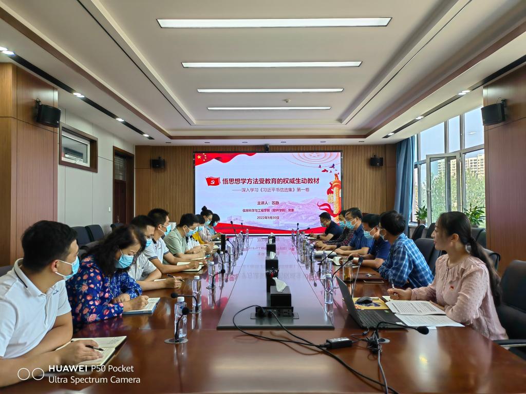 9月30日上午,信息科学与工程学院(软件学院)党委在一号楼336会议室召开理论学习中心组(扩大)第五次学习会议。本次学习会议主题为:悟思想学方法受教育的权威生动教材,深入学习《习近平书信选集》第一卷。学院领导班子成员、党委委员、专职组织员、教工党支部书记和全体辅导员参加了会议。会议由学院党委书记王昕主持。