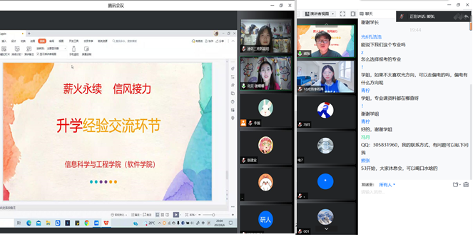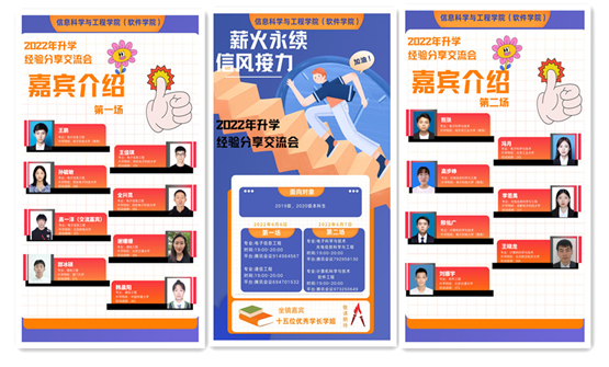 2022年6月6日晚、6月7日晚,信息科学与工程学院(软件学院)师生相聚云端,举办了两场2022年升学经验分享交流会。交流会共由15位2022届优秀毕业生主讲。来自不同年级的三百余名本科生参加了此次活动
