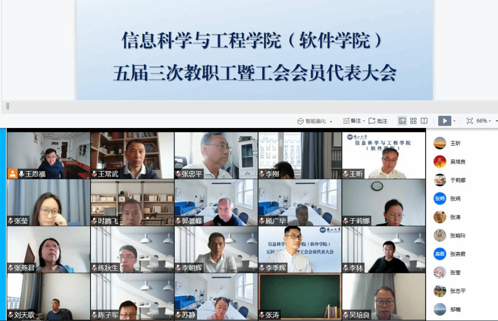 5月26日下午,信息科学与工程学院(软件学院)五届三次教职工暨工会会员代表大会在腾讯会议平台召开,代表们齐聚线上,建言献策,共话新时代新阶段学院的建设与发展。
