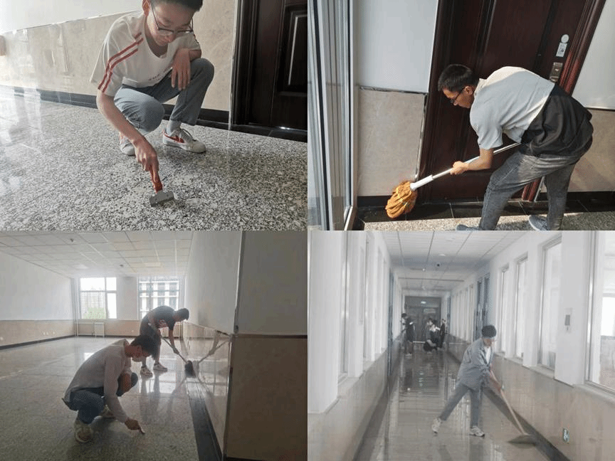 劳动主要在新馆1、2号楼公共卫生区域开展,近300名在校生参与其中,党员、团员、入党积极分子、学生干部充分发挥了示范引领作用。同学们使用铲刀对施工时地面残留的胶水、涂料等污渍进行了彻底地清洁。同时,使用拖布、抹布对公共区域的楼道、墙围进行了清洗。针对电梯轿厢遗留的污渍,进行了擦拭。