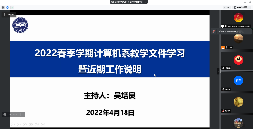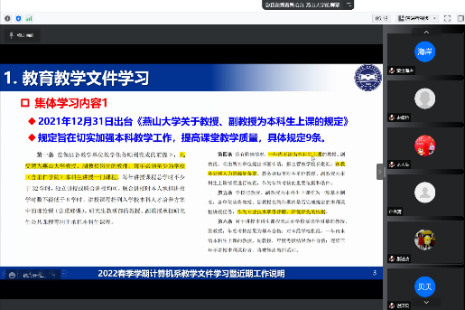 近年来,教育部、燕山大学相继出台了系列新的教育教学文件,为确保教师了解国家新的教育方针政策,悉知学校新的教学管理文件,计算机系于4月18日组织本专业教师通过网络方式集体学习相关文件,系主任吴培良主持本次学习活动。