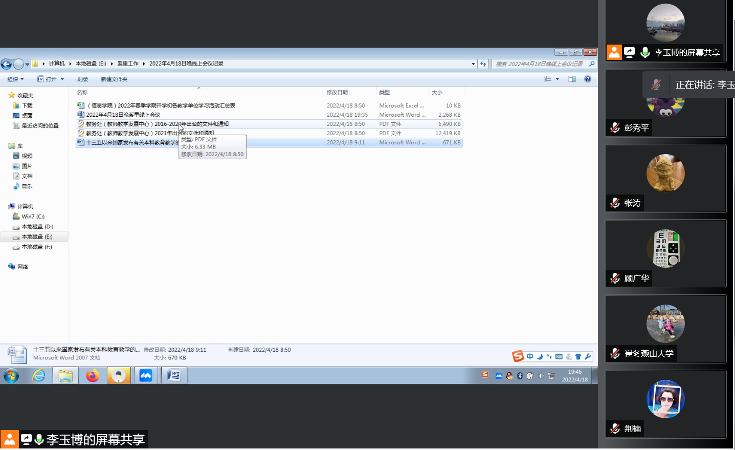 4月18日下午7:30,电子与通信工程系组织全体教师参加线上会议,集中学习十三五以来教育部发布的有关本科教育教学的重要文件以及燕山大学教务处(教师教学发展中心)出台的教学文件和通知。会议由电子与通信工程系主任顾广华主持,全体教师参加会议。