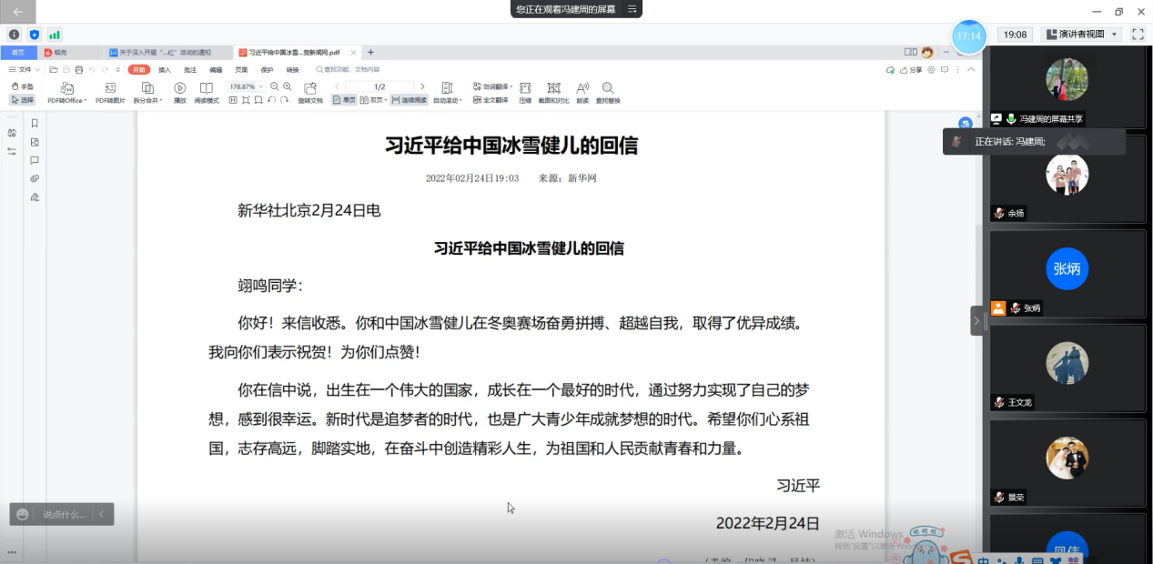 随后,全体党员共同学习了《习近平书信选集》第一卷中的部分内容,并认真学习了习近平写给中国冰雪健儿苏翊鸣的回信。如信中所说,我们出生在一个伟大的国家,成长在一个最好的时代,全体教师党员也表示希望能够在我们平凡的岗位上通过奋斗创造精彩人生,为祖国和人民贡献自己的青春和力量。