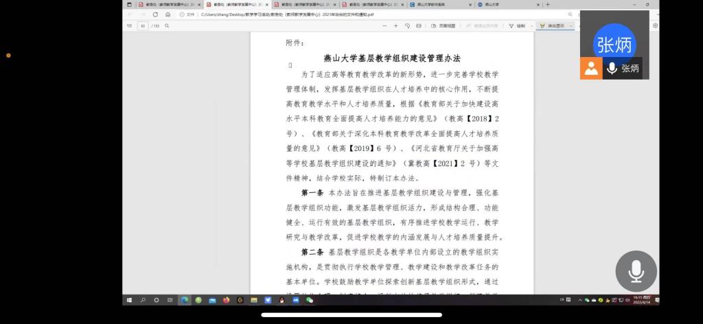 首先,全体教师共同学习了《燕山大学基层教学组织建设管理办法》、《燕山大学全英文(双语)课程建设管理办法》和《燕山大学“教学成就奖”、“教学标兵奖”、“青年教学标兵奖”评选办法(修订)》等教学文件。教师们根据文件内容,结合实际教学情况,积极发言,提供教学思路和建议。